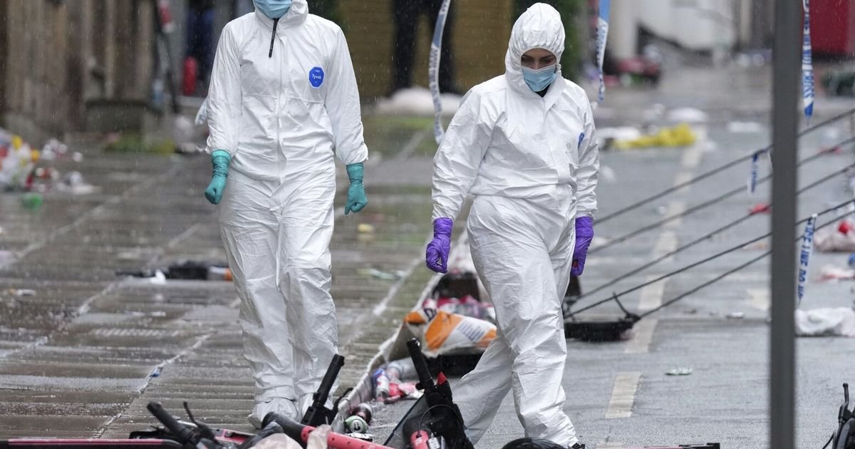 Los equipos de oficiales que usaban trajes forenses blancos buscaron las calles húmedas en busca de evidencia y tomaron fotos de ropa y otros artículos dejados atrás cuando la gente huyó de la escena caótica.
