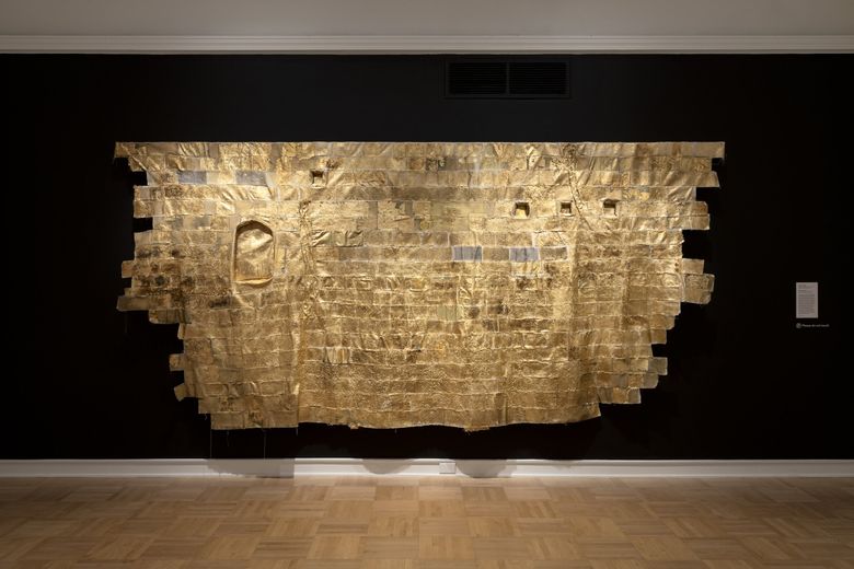 Una manta dorada espera en la Galería de Arte de Henry. Colgando alto y ancho como una piel bronceada, un patrón de ladrillos y rincones y perchas califica la tela: la reinvención de Namita Paul de una pared de la casa de sus abuelos en Pakistán actual. El lienzo de hojas de oro brilla con recuerdos de los días de verano, pero también recuerda la migración forzada de los abuelos de Paul después de la partición de la India británica en 1947. Llamado “testimonio”, es una de las muchas esculturas, pinturas, videos, fotos e instalaciones en esta nueva exhibición, que considera “cómo el arte puede puentes entre este mundo y las próximas características y las características de los stelups de los artículos Kelly Akashi, Korakrit Arunanondchai y Apichatpong Weerasethakul.