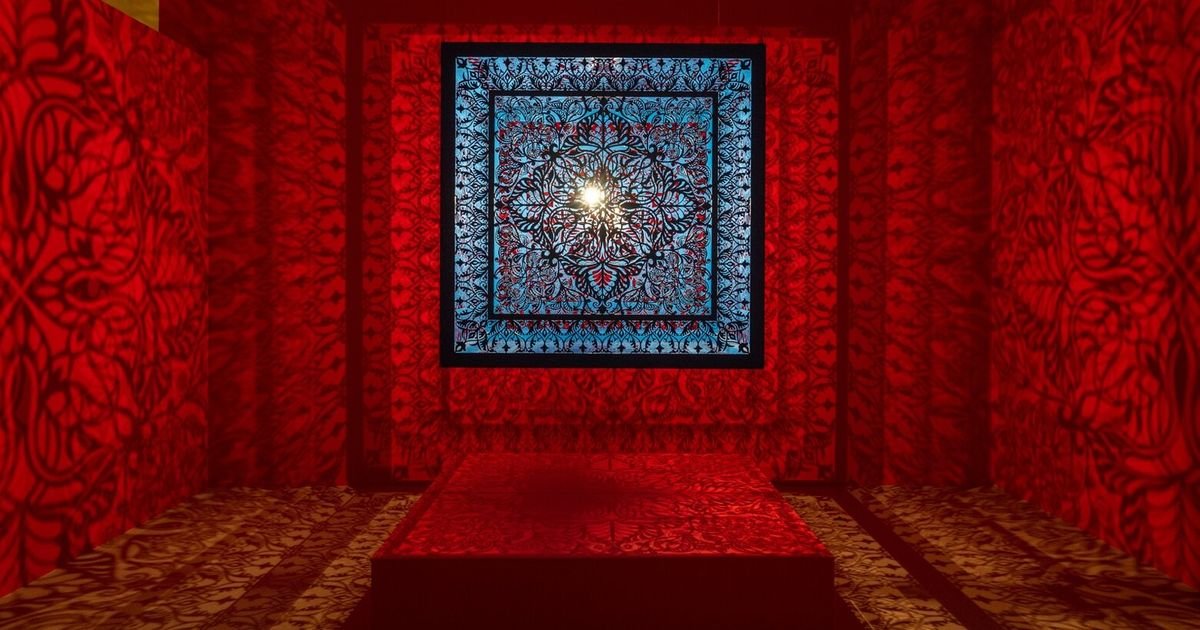 Todavía tengo que ver el trabajo de Anila Quayyum Agha en persona: este espectáculo es el debut del noroeste del Pacífico del artista estadounidense paquistaní. Pero solo ver una foto de su instalación “Una hermosa desesperación (azul)”, anteriormente a la vista en el Museo de Arte Americano de Amon Carter en Fort Worth, Texas, en mi pantalla, un corazón de cubo de cobalto flotando en un mar de arabescos carmesí, casi me dejó sin aliento. Los cubos de acero láser cortados con láser de Agha se encienden desde las linternas y las sombras estampadas en las paredes, inspirados en motivos geométricos comunes en las tradiciones arquitectónicas islámicas y otras.