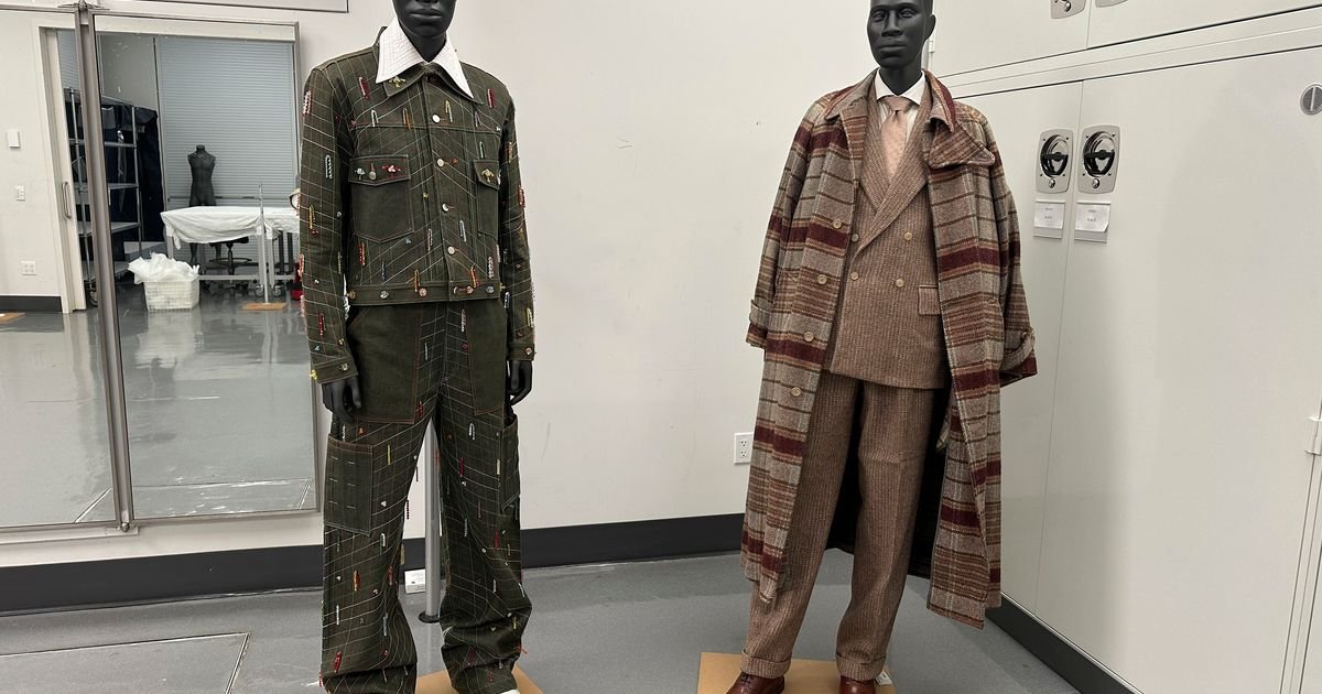 En una sala de instalación a fines del mes pasado, un empleado del museo trabajó minuciosamente en la restauración de esos pantalones de jockey, un cojín de alfileres listo. Cerca de ella, dos artículos ya colgaban de maniquíes. Uno era un traje clásico de Jeffrey Banks de 1987, una chaqueta y pantalones de doble pecho combinado con un abrigo de lana a cuadros elegante, el conjunto terminó con una corbata rosa claro.