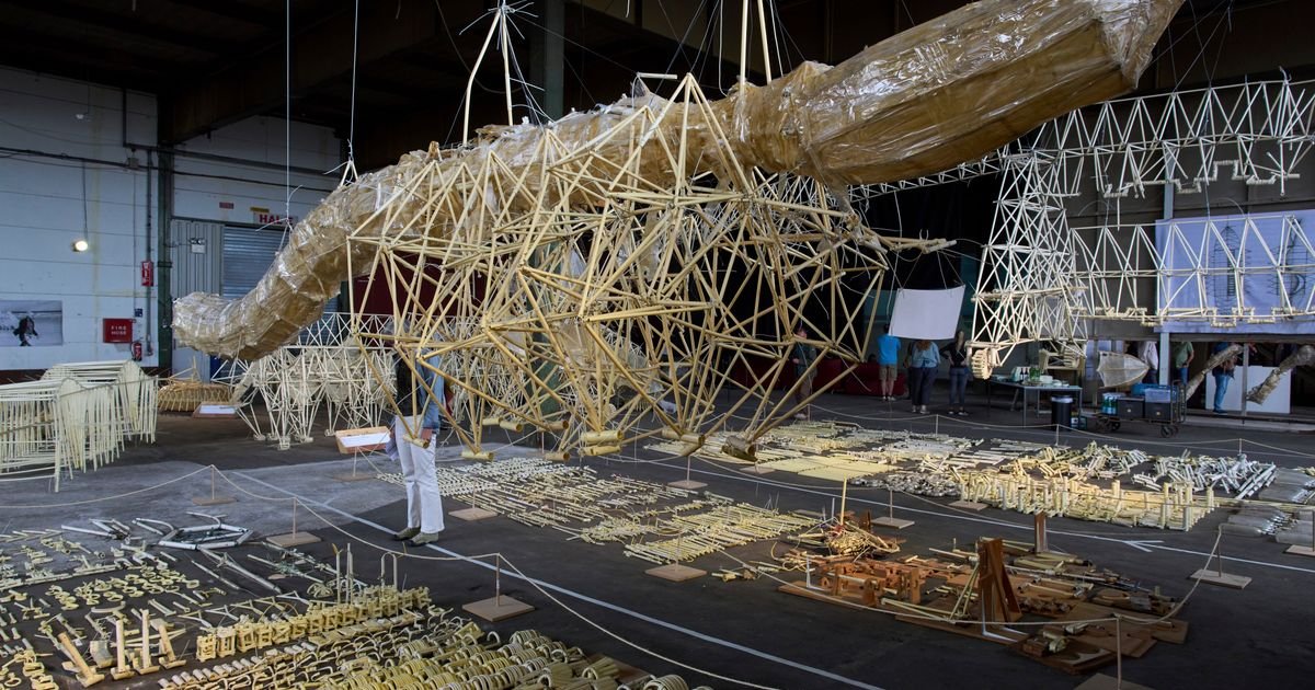 Los “huesos” de “Strandbeesten” de Theo Jansen, animales de playa en holandés, se han hecho cargo de una antigua fábrica de cable en Delft, la pequeña ciudad en el oeste de los Países Bajos que Jansen ha llamado hogar durante décadas.