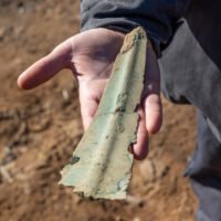 Probaban cuidadosamente el suelo con una pala y una llana en cuatro áreas del campo de maíz cosechado y descubrieron las dos cuchillas de daga de bronce a una profundidad de solo 30 centímetros.