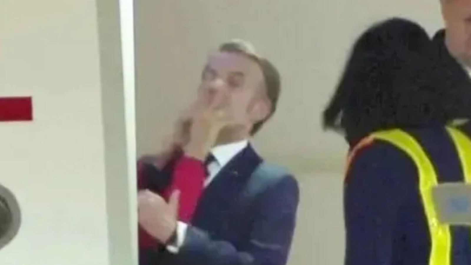 Macron se ve sorprendido después de darse cuenta de que la puerta del avión estaba abiertaCrédito: AP