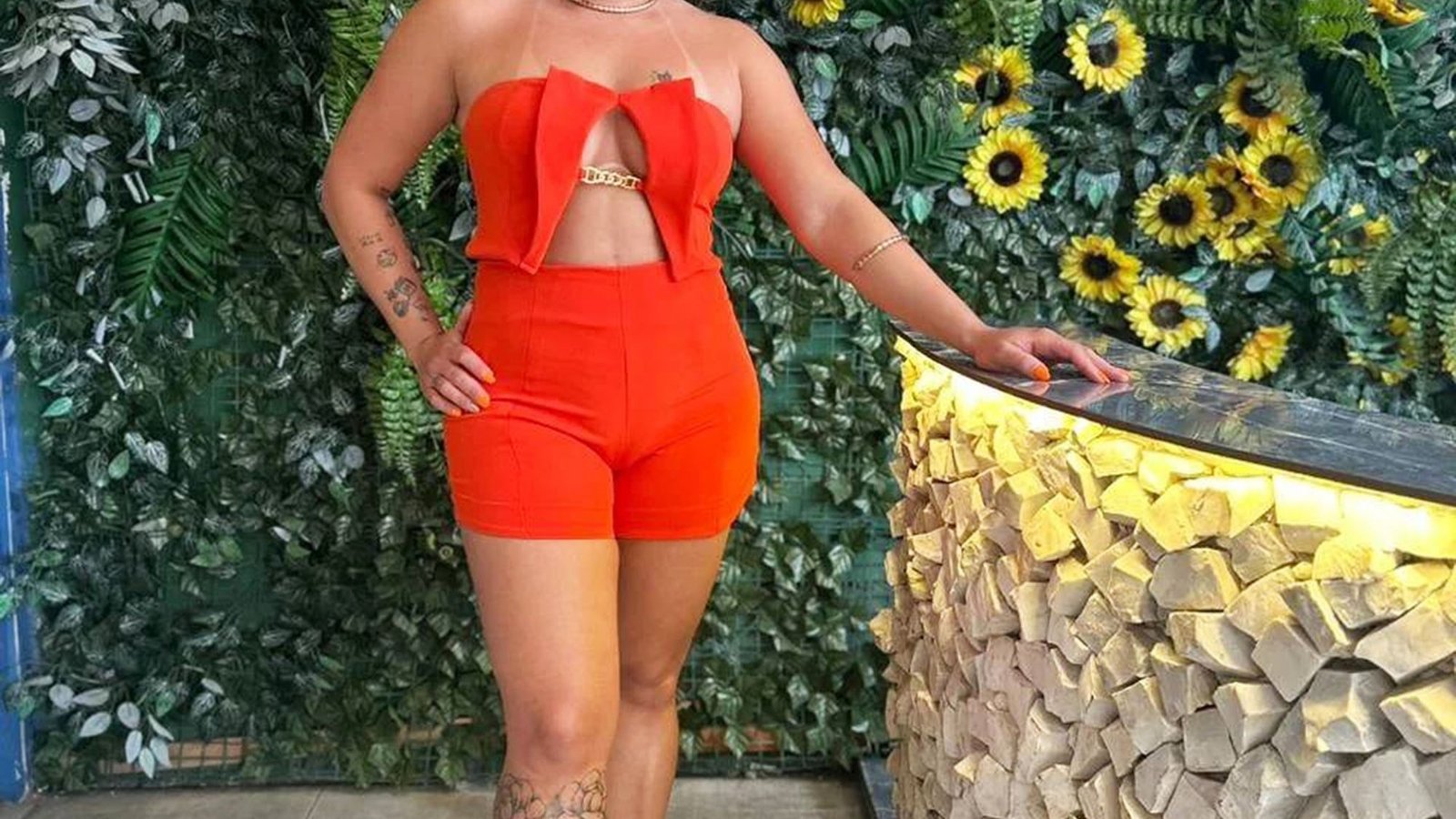 Mujer con atuendo naranja posando frente a la pared de girasol.