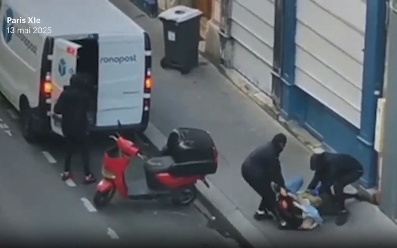 Las imágenes disparadas desde un edificio cercano y liberado desde que el impactante ataque muestra a tres hombres enmascarados que intentan obligar a la mujer a una camioneta de entrega de Chronopost blanca.