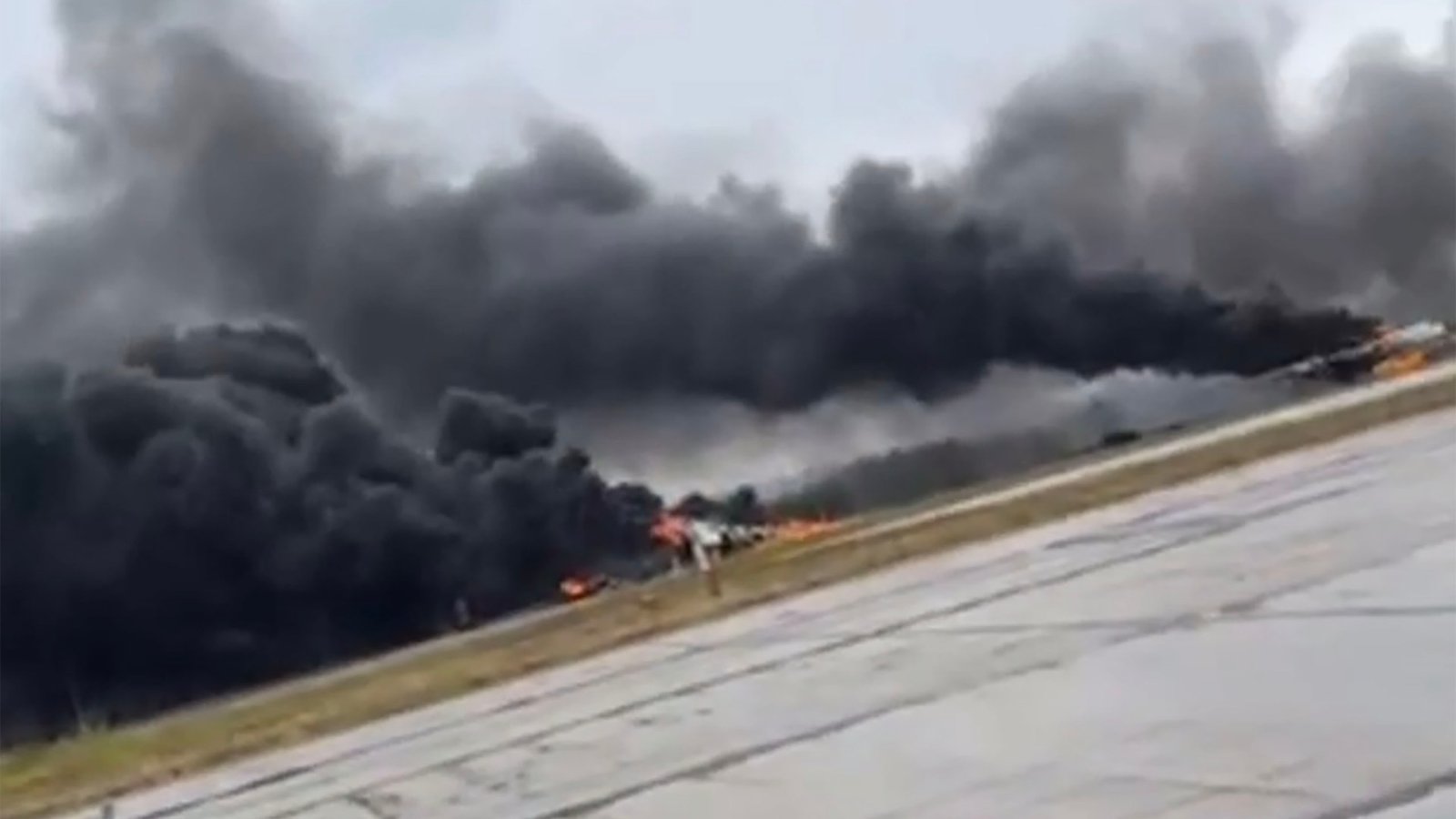 Gran columna de humo negro que se eleva desde un aeródromo en llamas.