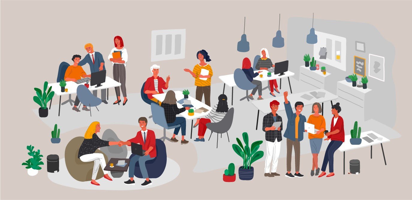 Ilustración de una oficina ocupada con muchas personas que trabajan y colaboran.