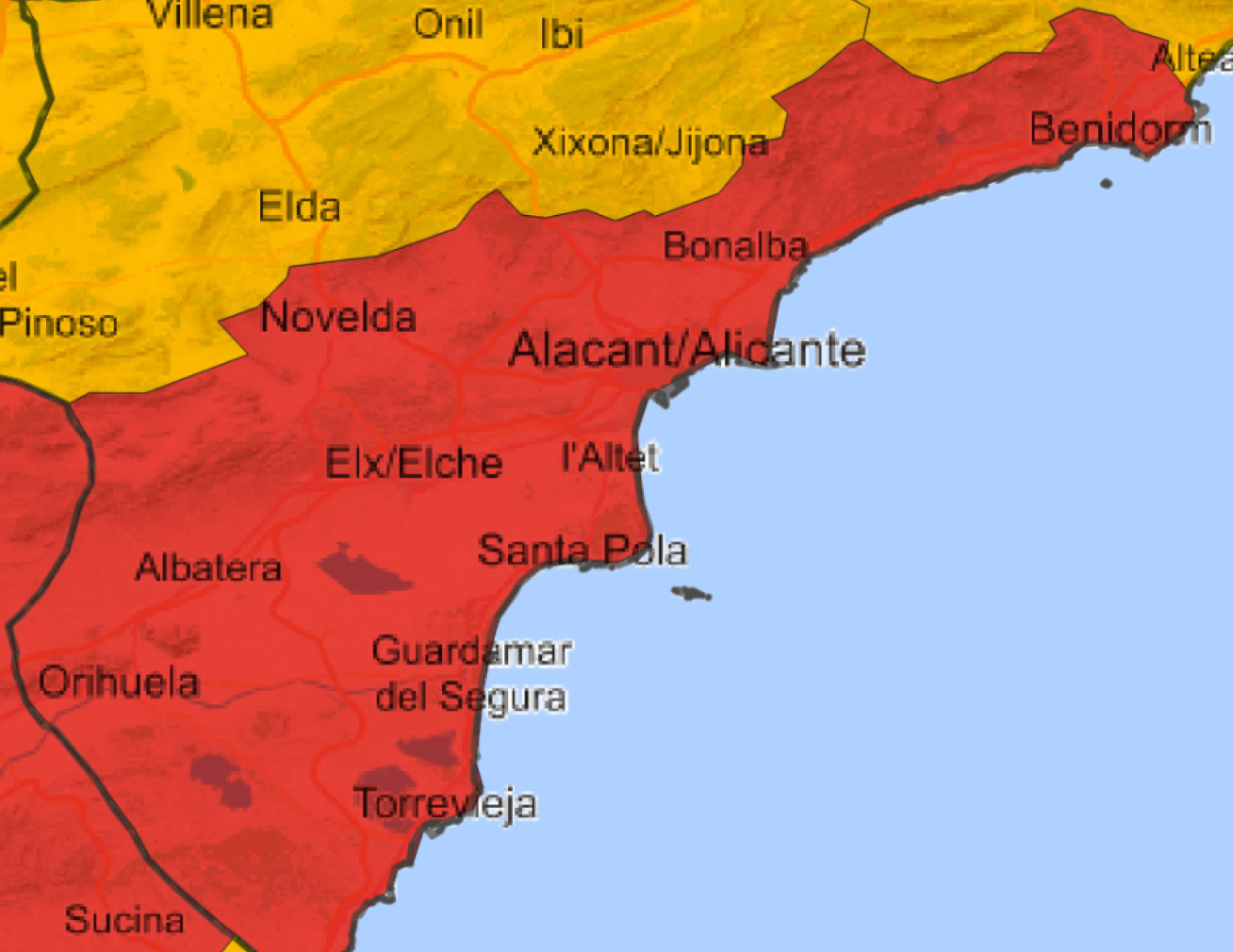 La agencia meteorológica de España, Aemet, ha emitido su nivel de advertencia máximo para la costa sur de Alicante, donde se esperan máximos de 42c o más, mientras que la región de Vega del Segura en Murcia podría superar 44c.