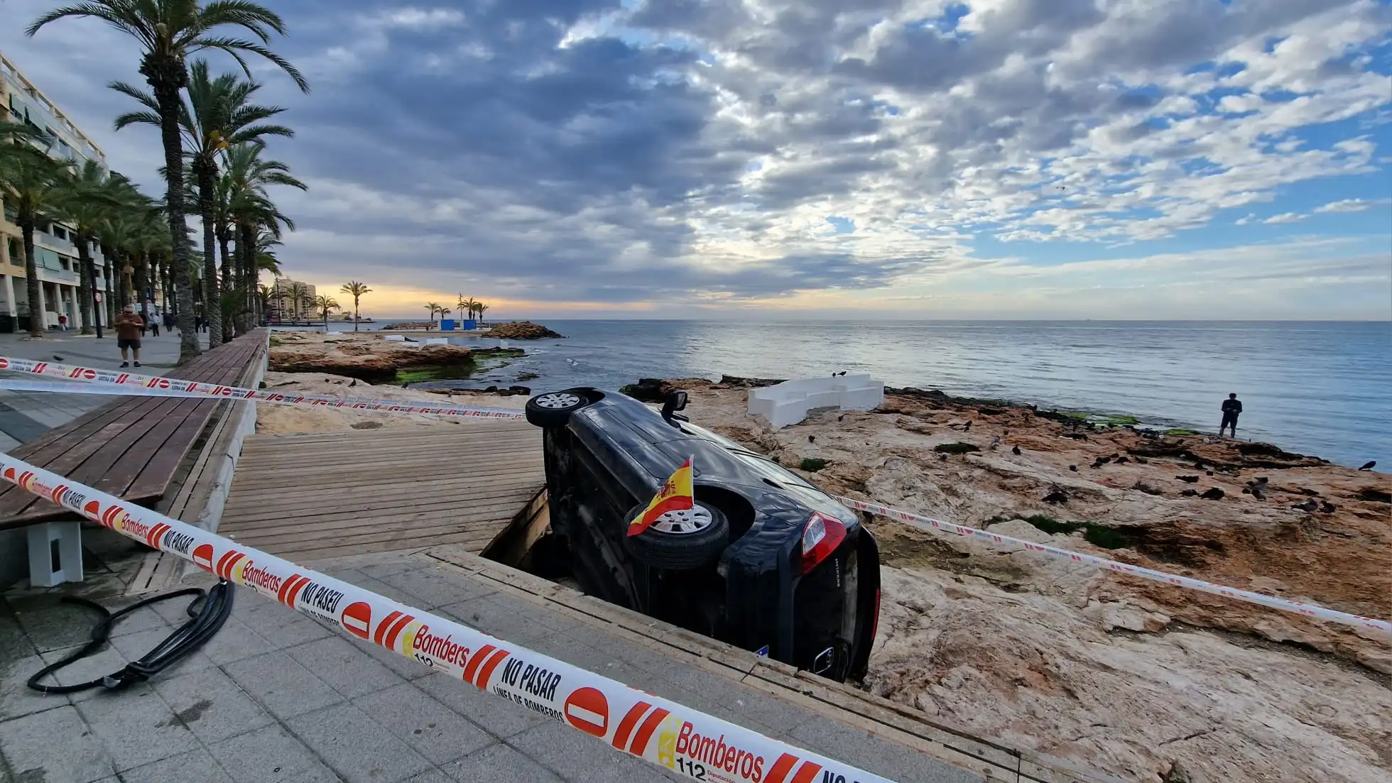 Los bomberos rescataron a un automovilista anciano atrapado en su automóvil después de que expulsó un paseo de Torrevieja y se volteó sobre su costado.