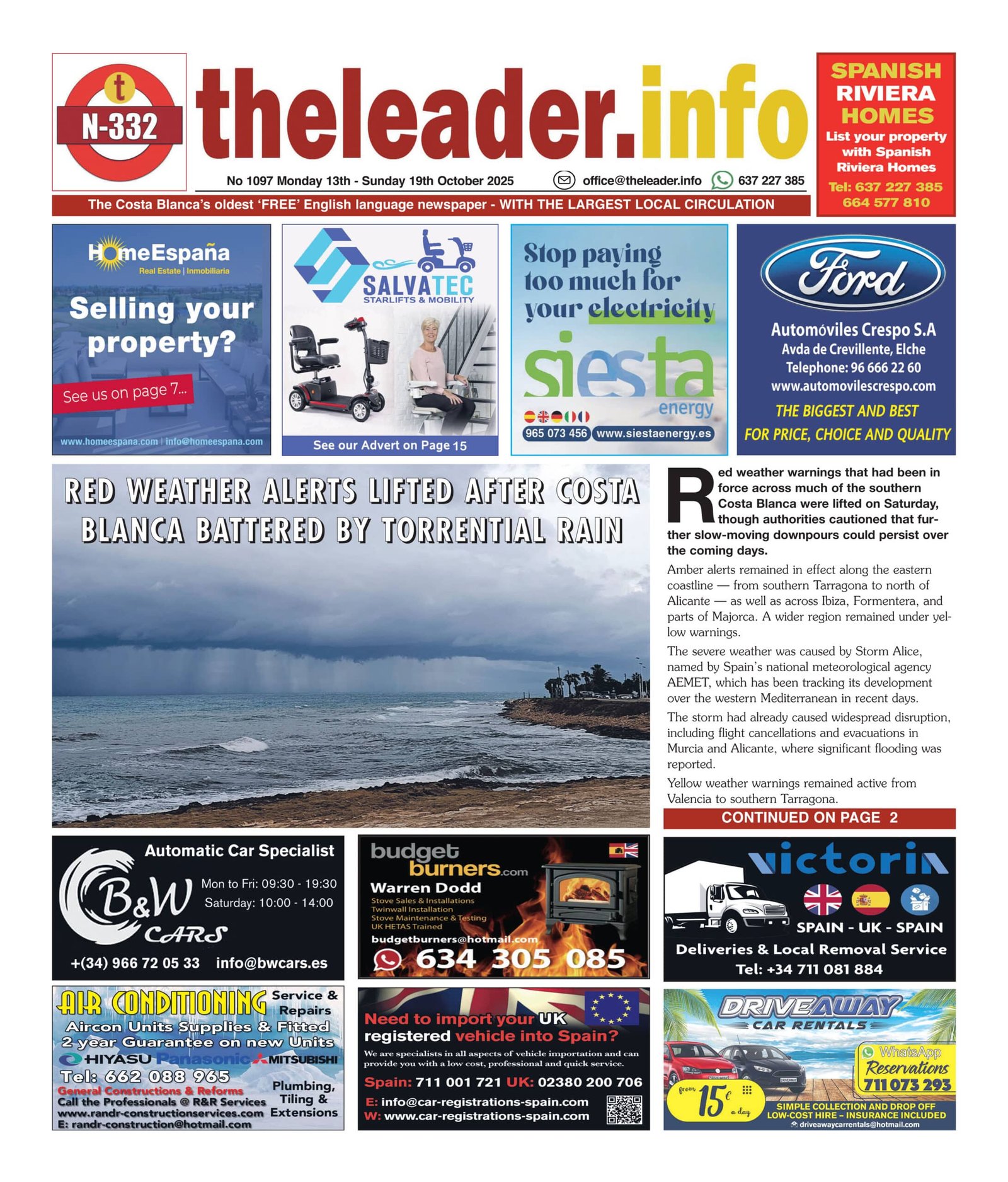 En la página 2 destaca la búsqueda del británico desaparecido Marc Tulloch Hewson, de 63 años, que ha entrado en su cuarta semana, con las autoridades españolas y voluntarios locales preparando una nueva operación de búsqueda coordinada alrededor del Lago Jardín y Los Balcones, cerca de Torrevieja, mientras que en la página 5 la noticia de la pérdida de uno de los mercados dominicales más populares de la región en Guardamar, que ha sido cerrado después de 30 años por el ayuntamiento.