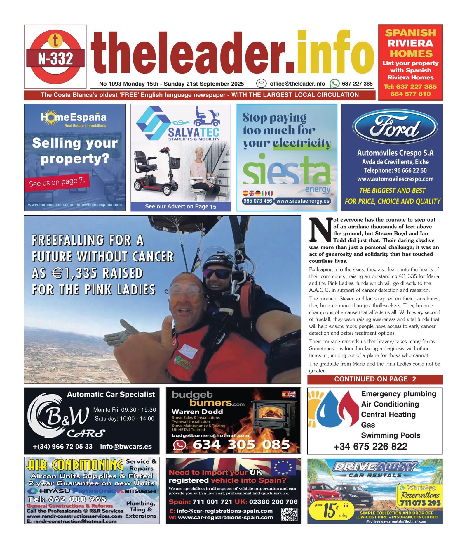No todos tienen el coraje de salir de un avión a miles de pies sobre el suelo, pero Steven Boyd e Ian Todd hicieron exactamente eso. Con su atrevido paracaidismo también saltaron a los corazones de su comunidad, elevando un excelente euro1,335 para María y las damas rosadas, fondos que irán directamente al AACC en apoyo de la detección e investigación del cáncer.