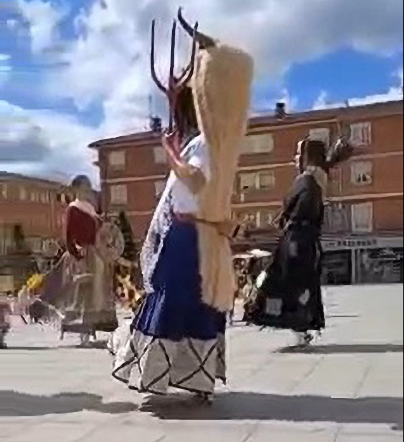 Una bailarina vestida como un gigante con tocado de toros con cuernos y un delantal sangriento causó terror cuando cayeron sobre un niño pequeño.