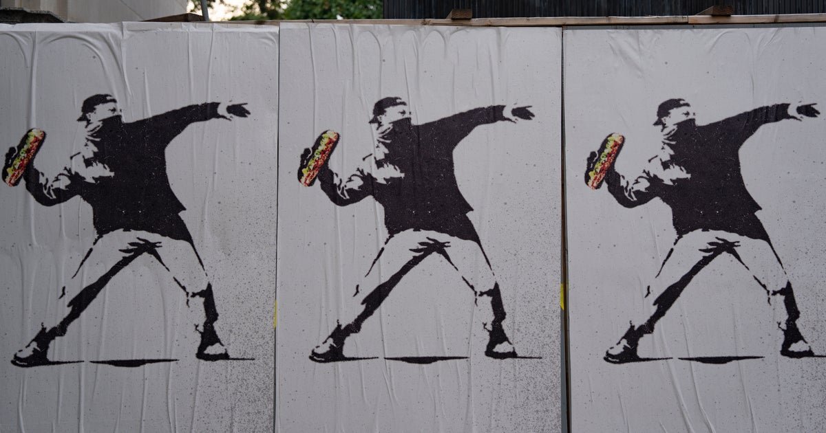 Durante el fin de semana, los carteles conmemorizados por el asalto del sándwich subieron por toda la ciudad. La imagen, un riff de un mural del artista callejero Banksy, representa una figura enmascarada con el brazo recogido como para tirar una roca o un cóctel Molotov, pero está sosteniendo un colorido hoagie. (En el original de Banksy, es un ramo de flores).
