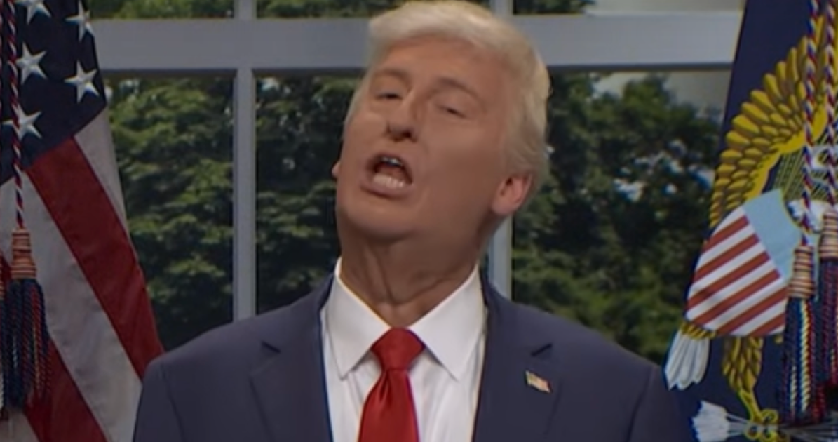 El imitador de Trump del programa de bocetos, James Austin Johnson, se presentó como “su presidente favorito y quizás su próximo Papa” antes de mirar hacia atrás en sus logros, como prohibir las pajitas de papel y el desalentador de PBS.