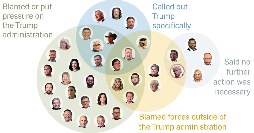 Others were less measured. Alex Jones, the conspiracy theorist and radio host, asked on X, “Why is 47 making the worst moves of his tenure in the last 9 years?” (Mr. Jones has also questioned the administration’s actions and blamed outside forces.) The actress Roseanne Barr, one of Mr. Trump’s most loyal supporters, told the president to “read the damn room.”