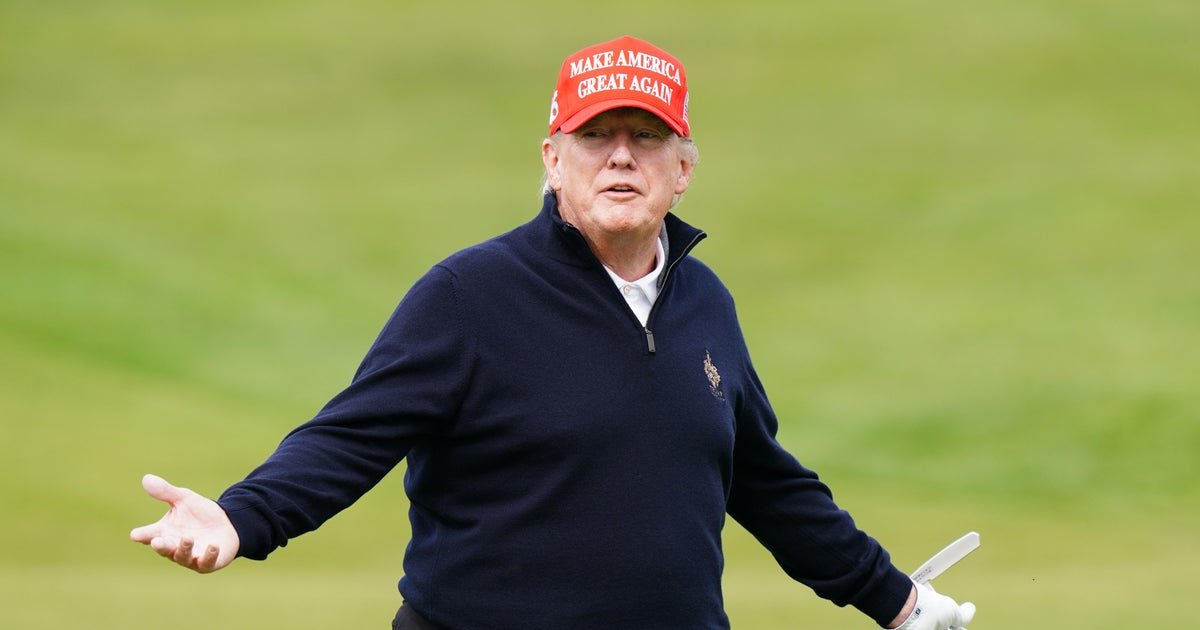 Se ve a Donald Trump jugando al golf en uno de sus campos de golf escoceses, en Turnberry, South Ayrshire, en una foto de archivo tomada durante una visita al Reino Unido el 2 de mayo de 2023, en el período entre sus dos términos como presidente de los Estados Unidos.