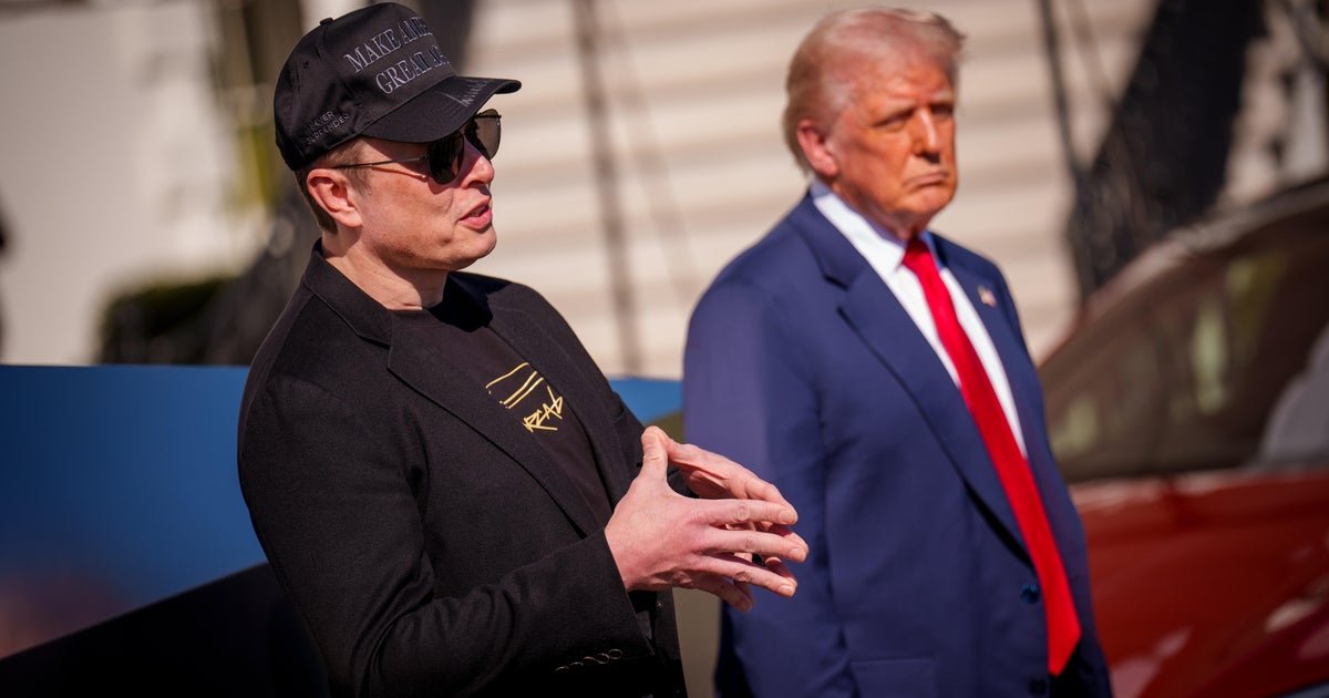 El presidente Trump escucha como asesor principal de la Casa Blanca, el CEO de Tesla y el CEO de SpaceX, Elon Musk, habla junto a un camión cibernético Tesla y un Modelo S en el South Lawn de la Casa Blanca el 11 de marzo de 2025 en Washington, DC.