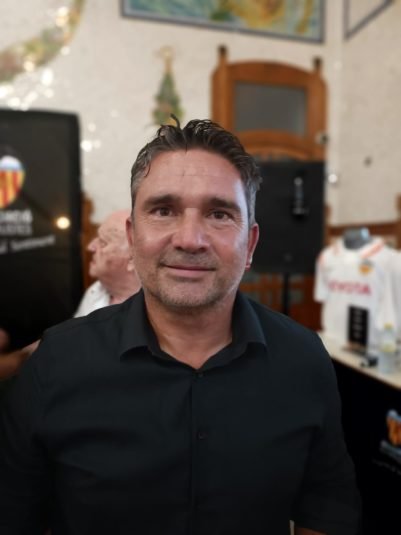 Juan Sánchez, un muchacho local, nació y se crió en el pueblo de Aldaia (cerca de Valencia) y todavía vive allí. Pasó por las filas de la Academia VCF y se incorporó al primer equipo en la temporada 1992-93. Durante su etapa como jugador en el Valencia CF ganó la Supercopa (1999-2000), la Liga (2001-02 y 2003-04) y la Copa de la UEFA (2003-04). También consiguió subcampeonatos en las finales consecutivas de la Liga de Campeones de 2000 y 2001. La trayectoria del Valencia CF fue inigualable en este periodo. De hecho, la UEFA eligió al Valencia CF como “mejor equipo del mundo” en 2004. Debido a su estatura compacta y su rapidez de pensamiento en el área, su cariñoso apodo en Mestalla fue “El Romario d’Aldaia”. Hasta el día de hoy, a pesar de todos los elogios, sigue siendo un exjugador humilde y accesible. Sobrevivió a las terribles inundaciones de ‘La Dana’ en su ciudad natal y ha vivido para contarlo. Como voluntario activo, Juan se había involucrado y también estaba ayudando con la recuperación en Aldaia.